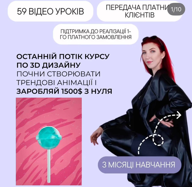 Своїх учнів я навчаю не тільки створенню 3D дизайнів, а і те, як залучити перших клієнтів уже на курсі. Також я не встигаю брати багато замовлень, тому своїх клієнтів передаю найкращим учням.