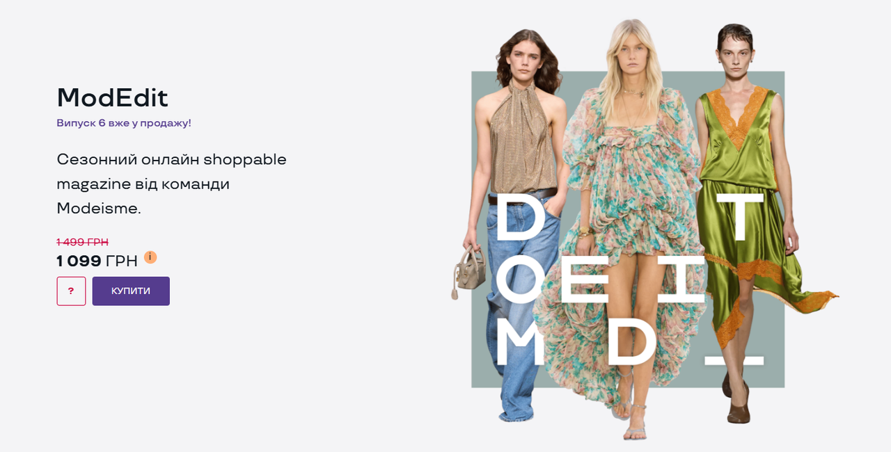 ModEdit – це понад 400 сторінок корисного й унікального контенту, який створює для вас наша команда щосезону. Більш ніж 1000 речей у підбірці, 300+ луків на всі випадки життя, селекція позицій з усіх цінових сегментів.