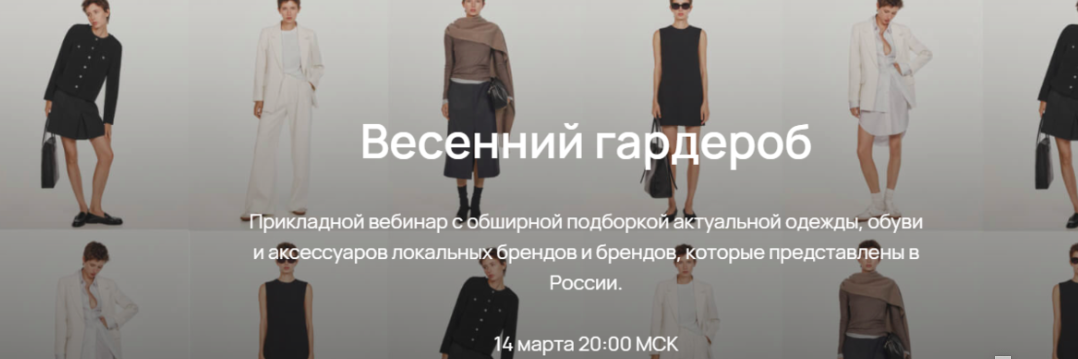 Весенний гардероб — прикладной вебинар с обширной подборкой актуальной одежды, обуви и аксессуаров локальных брендов и брендов, которые представлены в России.